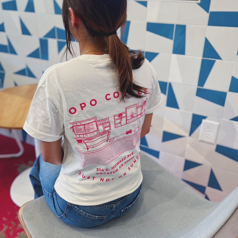 We think our bar at 314 is pretty fun to look at. With the bar front mimicking the lines in our logo and the bright pink espresso machine, you can't help but smile! A friend of the shop did this awesome line drawing and we thought - what better way to show your love for Opo than to literally wear the shop on your sleeve (or your back)?