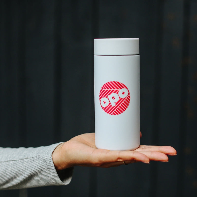 This double-wall vacuum insulated MiiR 360 Traveler is perfect for when you're on the go. Its Leakproof 360 Lid couldn’t be easier to use: press the center button, sip from any side, then press again to seal. With both our logo and coffee branch emblem, you'll be showing your love of Opo and cofffee!